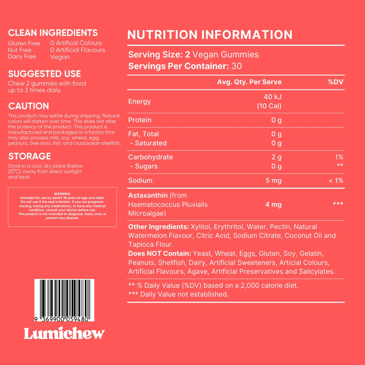 Lumichew contains Astaxanthin, a plant-based carotenoid sourced from Haematococcus Pluvialis microalgae.